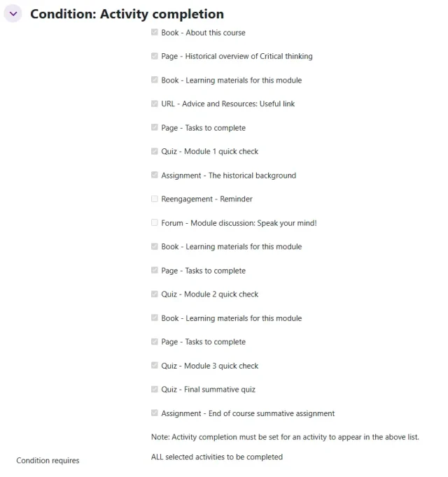 CE requires learners to do more than just click through a course. Moodle’s built in completion tracking enforces prerequisites, for example, watching a lecture, passing a quiz, and submitting an evaluation form before credits are released. By using conditional activities, administrators can ensure that credits are only awarded when every step is properly completed.